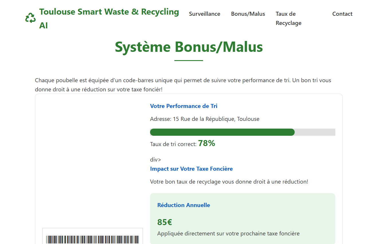 Solution: Our artificial intelligence revolutionizes waste management by: 🔋 IoT Sensors: Real-time monitoring of connected trash bins. 🧠 Predictive Algorithms: Anticipation of waste peaks and dynamic route optimization (-20% kilometers driven). 📊 Citizen Blockchain: Unique barcode per household turning your sorting into tax reduction (up to €85 off property tax).